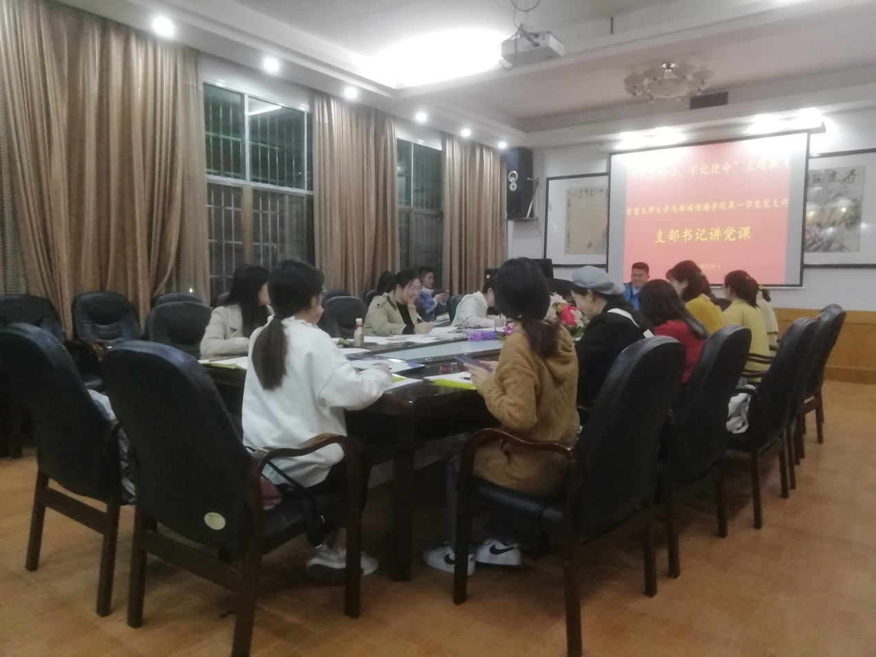 本网讯(学生记者 田元伟)10月31日,我院第一学生党支部在砂子坳校区影视鉴赏室召开党课学习常规会议,本次学习的主题是“不忘初心、牢记使命”——新时代大学生要有新气象,更要有新作为。学习内容由支部书记刘建新主讲,第一学生支部全体党员到场参会。