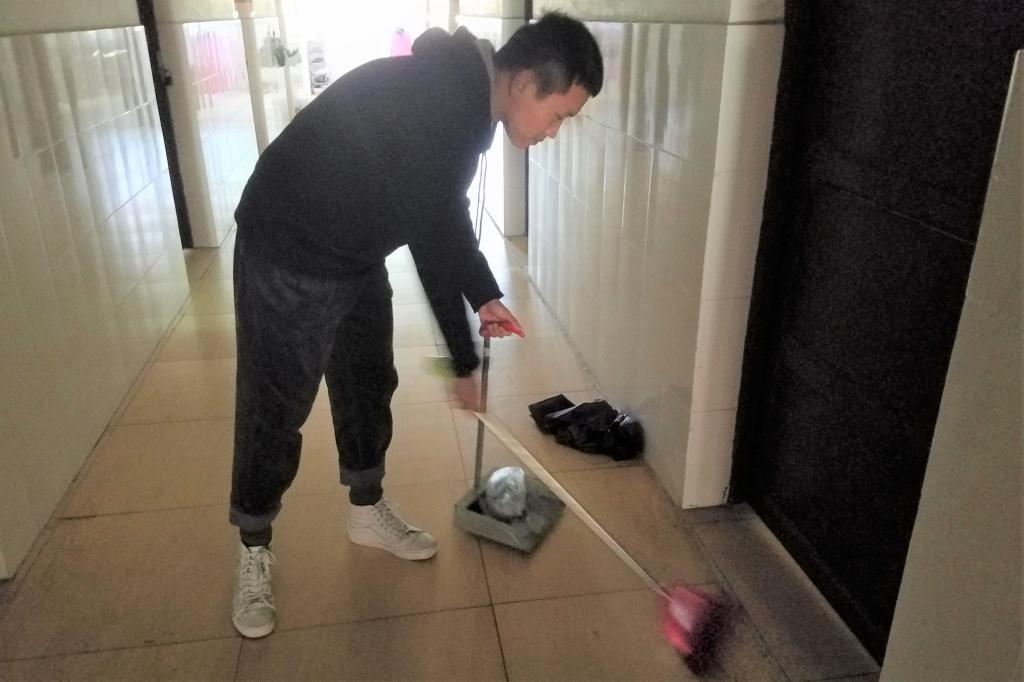 28日中午12时30分,全体党训班人员分为十组,在砂子坳校区11栋学舍前坪集合签到,准备好打扫工具,随后进入学生宿舍楼打扫走廊、楼梯等周围公共区域。