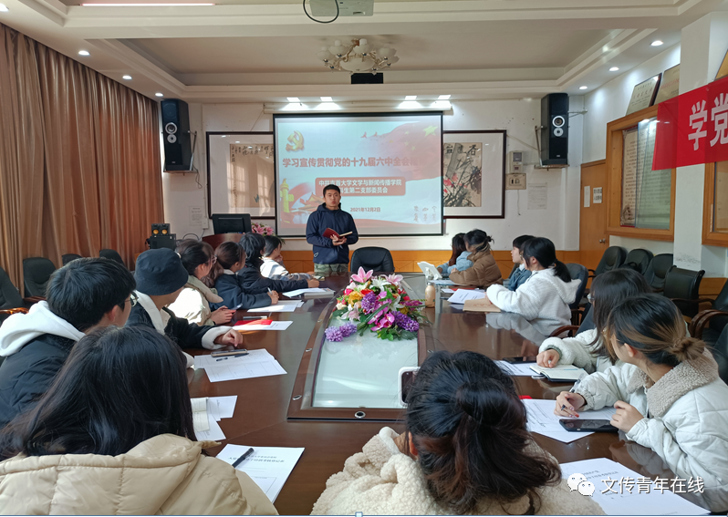 本网讯(通讯员 刘亮 罗骞)12月2日,yL23411永利集团文学与新闻传播学院本科生第二党支部于第一教学楼影视鉴赏室进行了党的十九届六中全会宣讲会议。本科生第二党支部全体党员参与了本次会议,本次会议由第二党支部书记刘建新主讲。