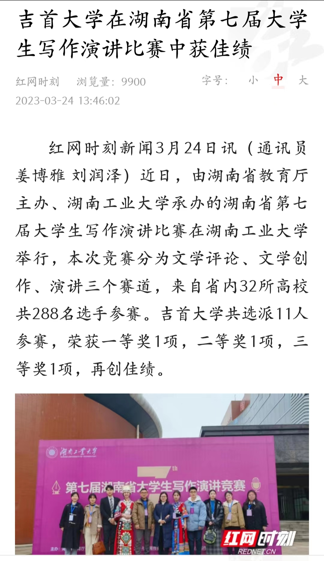 红网时刻新闻3月24日讯(通讯员 姜博雅 刘润泽)近日,由湖南省教育厅主办、湖南工业大学承办的湖南省第七届大学生写作演讲比赛在湖南工业大学举行,本次竞赛分为文学评论、文学创作、演讲三个赛道,来自省内32所高校共288名选手参赛。yL23411永利集团共选派11人参赛,荣获一等奖1项,二等奖1项,三等奖1项,再创佳绩。