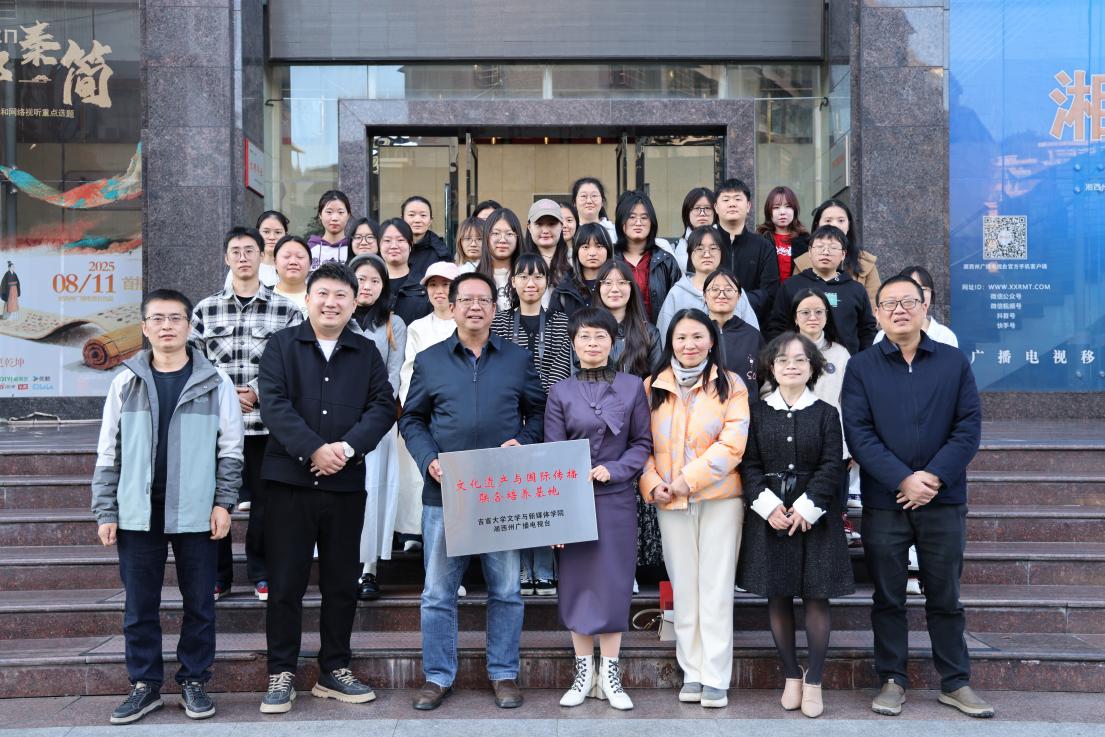 本网讯(通讯员:林茹玉、谢淑惠)11月14日下午,yl23411永利集团组织新闻与传播专业、新闻传播学专业2025级全体研究生,在学院院长瞿建慧、导师陈文敏的率领下赴湘西州广播电视台进行参观交流,并举行“文化遗产与国际传播联合培养基地”签约授牌仪式。湘西州广播电视台党委委员、副台长向华,组织人事部部长周杨,新闻中心主任罗永健,记者通联部主任易灏,新闻中心副主任王庭甫,资深主持人董波等出席仪式并陪同参观。