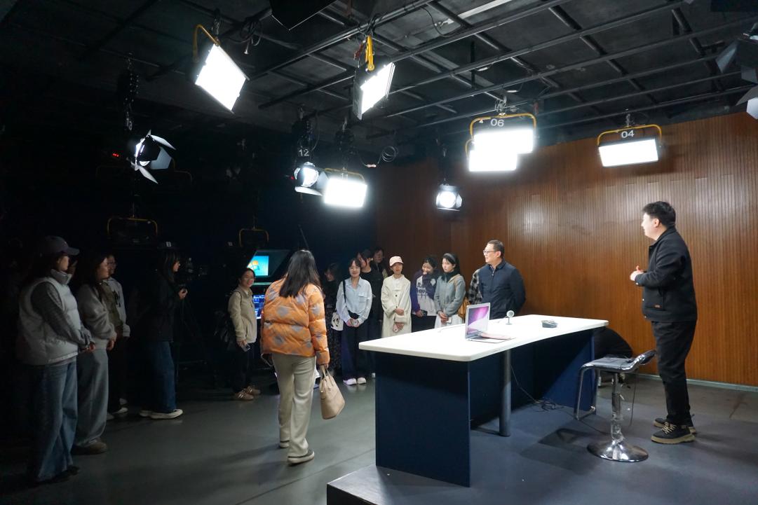 在湘西州广播电视台工作人员的引领下,师生一行先后参观了新媒体直播间、演播大厅、新闻中心及融媒体中心等核心部门。通过实地了解从传统电视节目制作到全媒体内容生产的整个流程,同学们对传统媒体与新媒体融合发展的行业现状及前沿趋势建立了直观而深刻的认知。