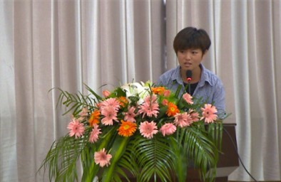 图为 新生代表安昭旭同学发言 最后,来自2012级新闻班的老生代表张东初同学发言, 2013级中师1班的安昭旭代表新生发言。他们代表我院全体学生对文学院的老师表达了节日的祝福,并表示,“做文学院的学生,就要做好优秀的准备”,“今天我们以吉大为荣,明天定让吉大以我们为荣”。