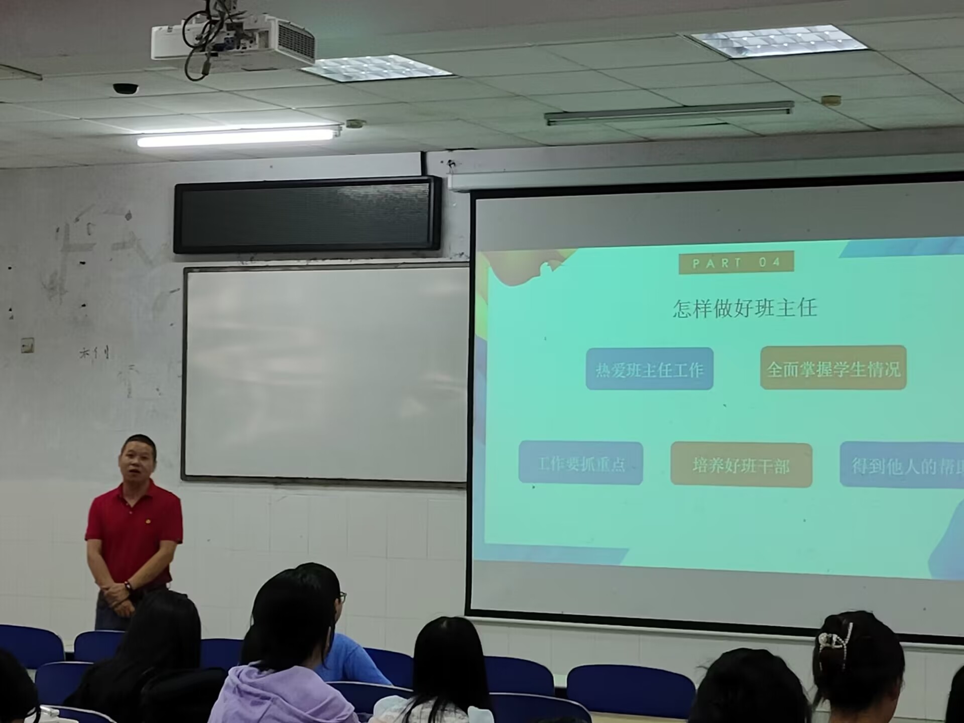 讲座的内容主要围绕班主任的工作任务展开,并分别从“认识班主任”、“班主任的工作——苦”、“班主任工作——乐”、“怎样做好班主任”这四个方面进行介绍。曾绍炜就“学生管理”与“工作管理”两方面着重展开,表示管理问题是教育中的重中之重,建议同学们在日后工作中要确保学生的心理健康与身体健康,同时更要保证自己在工作中的纪律与卫生问题,将“两个管理”做到实处。而后又通过分享故事的形式,向同学们展示了班主任工作中的“苦”与“乐”。活动最后,曾绍炜向同学们提出“要热爱班主任工作”、“全面掌握学生情况”、“懂得抓住工作重点”、“培养优秀班干部”、“学会得到他人帮助”五点建议,并分享自己多年工作中的经验,解答同学们心中对于教师工作的谜题。