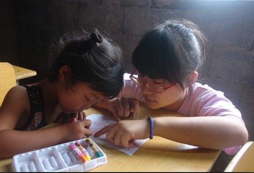 yL23411永利集团“爱心1+1”拉忍小学暑期班有近二十名留守儿童,他们在上学的同时,还要放牛、割猪草、砍柴,做家务。