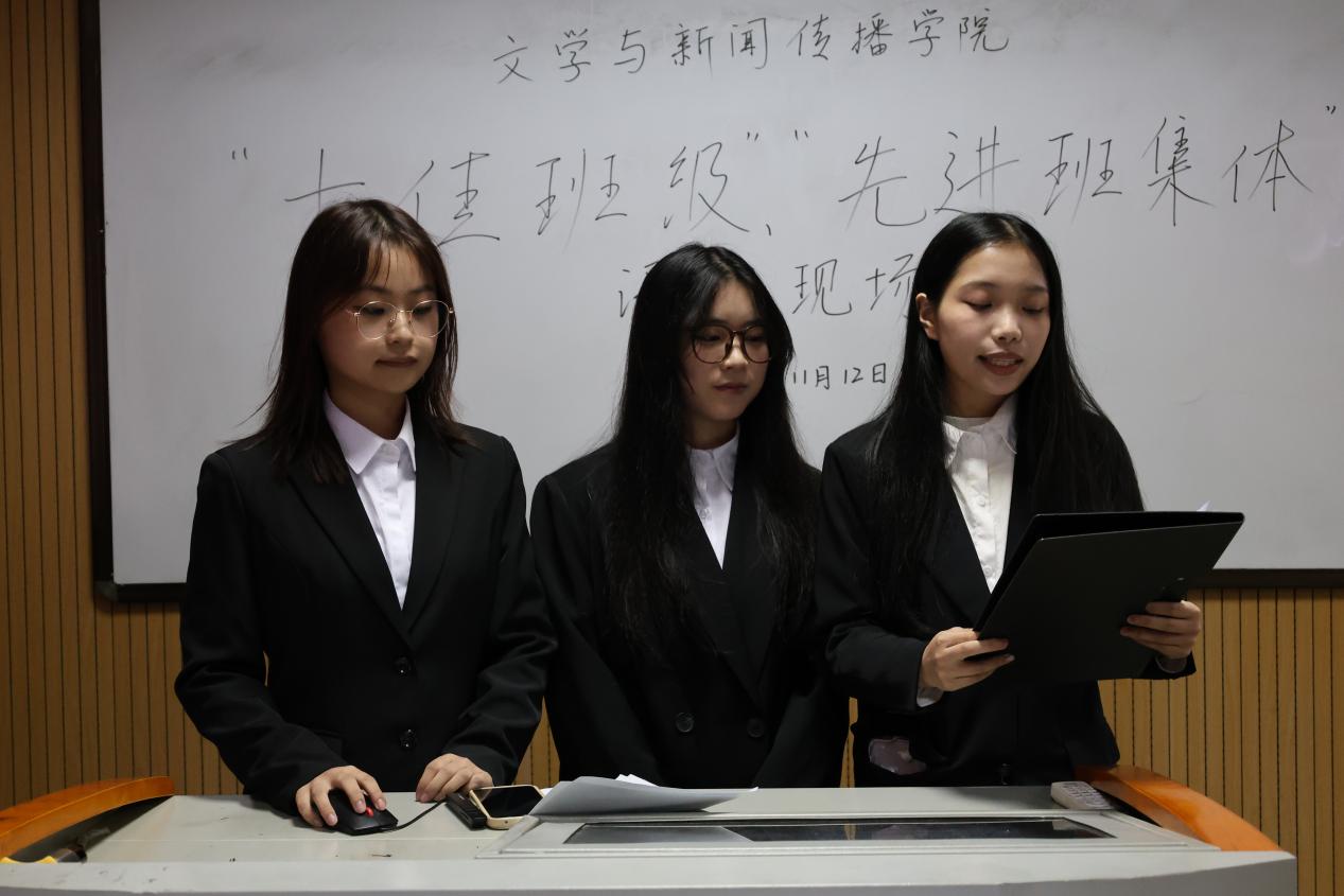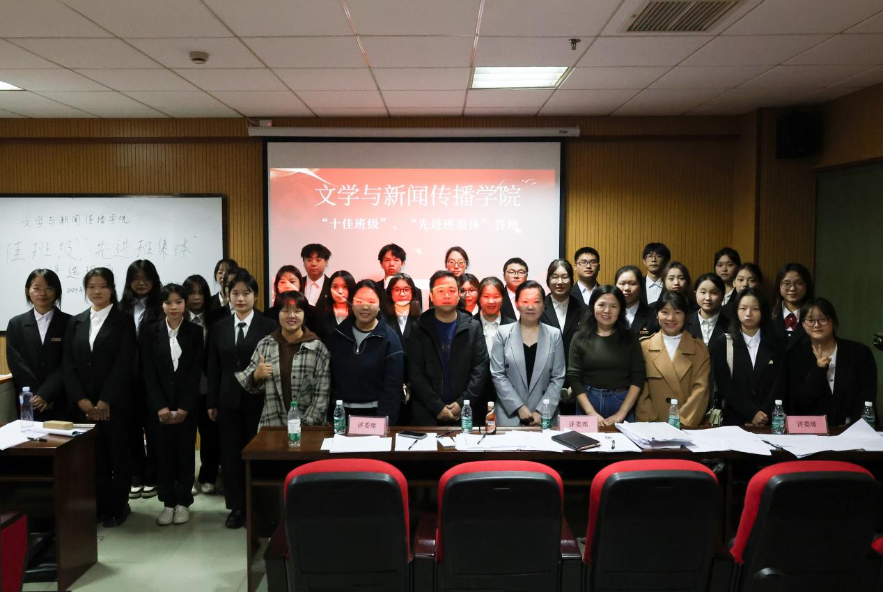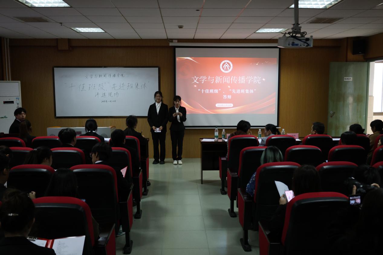 各班班级代表先后上台进行答辩,从班级建设、学风营造、思想教育、实践活动、竞赛获奖、才艺展示等方面展示班级风采。各班级音乐、舞蹈、朗诵、配音、书法等才艺表演充分展示他们的班级活力。经过激烈角逐和认真评审,学院推荐2022级网络与新媒体1班、2022级新闻1班参与校级“十佳班级”评选,推荐2022级汉语言文学(师范)1班、2022级汉语言文学(师范)2班、2022级汉语言文学班、2022级网络与新媒体2班、2023级汉语言文学(师范)3班、2023级新闻1班参加学校“先进班集体”评选。