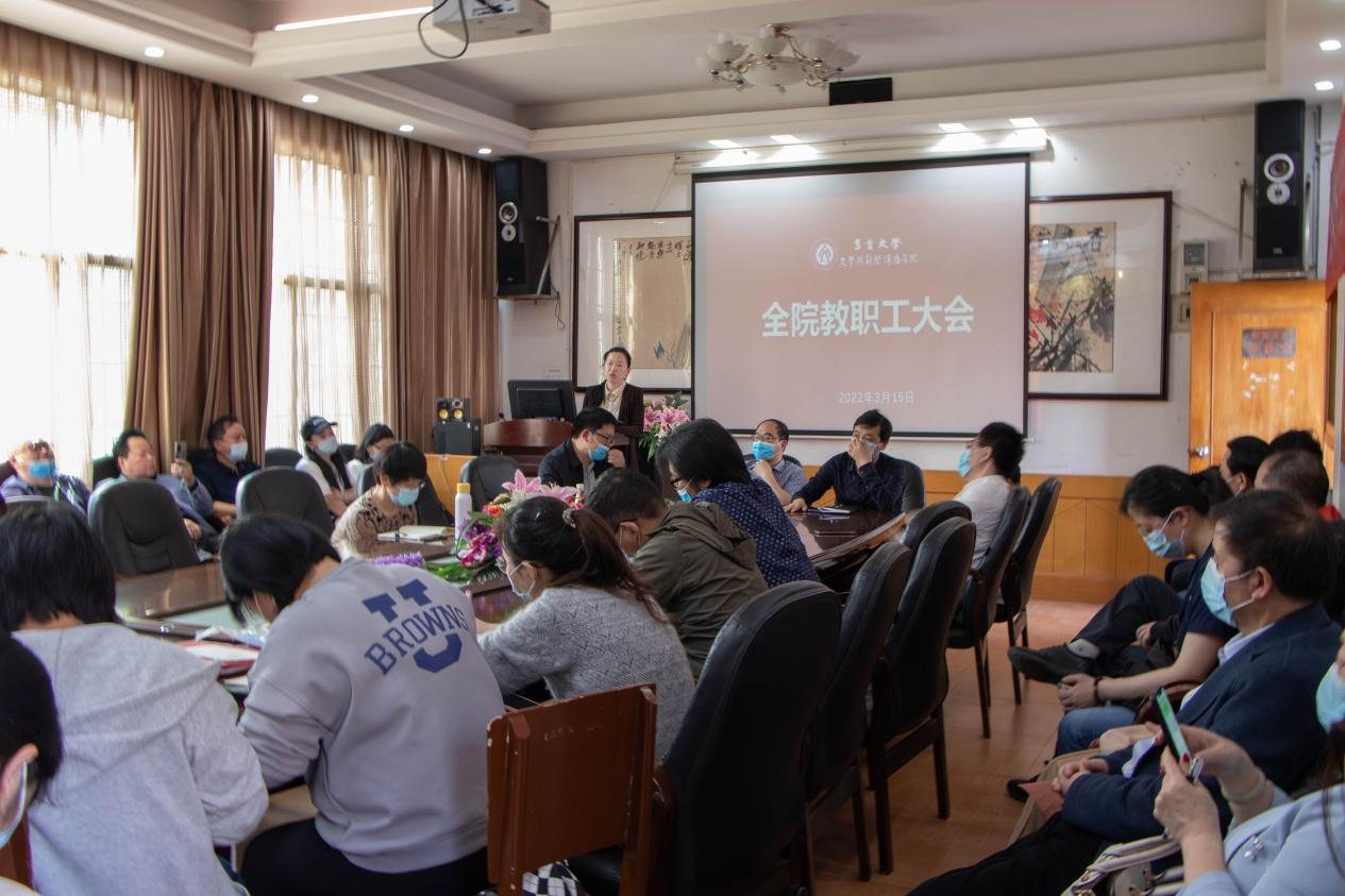 本网讯(通讯员 李霞 刘一丹)为进一步加强疫情防控工作,确保学院各项工作有序推进。3月15日下午,我院在学院影视鉴召开全院教职工大会,全体教职工参加会议。本次会议由院党委副书记段武城主持。