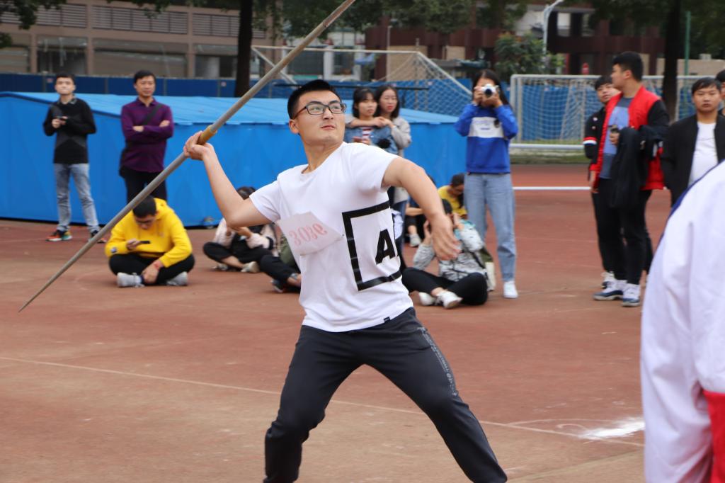 只见标枪赛场上的我院选手芮维泽此时正紧握着标枪跃跃欲试,目光犀利,脸上充满着自信,洋溢着一股青春正当时的气息。只听主席台上同学们的助威呐喊声,一波赛过一波,只为让赛场上的选手们能感受到大家的热情和对他的支持,发挥出最佳的水平。