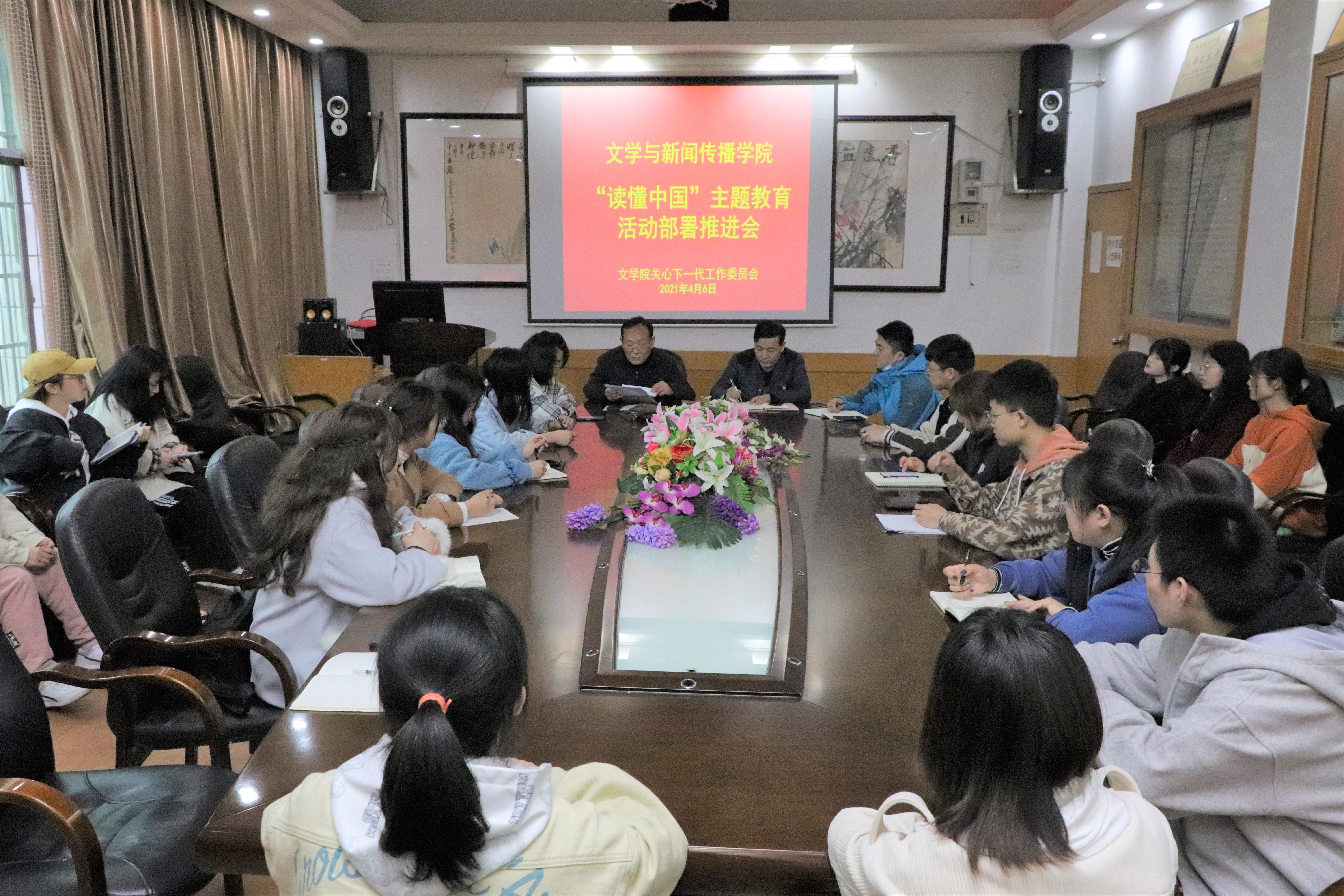 本网讯(通讯员 邱馨瑶 李美玲 李羽湛)为深入学习贯彻习近平总书记对关心下一代工作的重要指示精神,全面落实《新时代爱国主义教育实施纲要》,迎接中国成立100周年,我院于4月6日在影视鉴赏室召开“读懂中国”主题教育活动部署推进会。我院关心下一代工作委员会主任杨龙斌、常务副主任张和宇出席会议,院辅导员刘建新主持会议,院新闻中心、学通社、网宣中心参会。