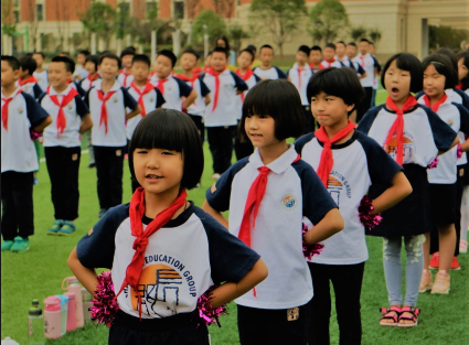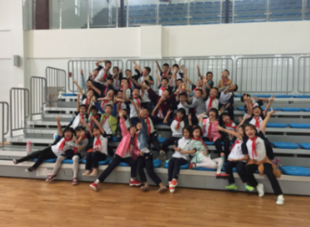 运动会在全体小学部师生的期盼中,在孩子们的欢呼声中开始。实习老师在队伍后面和学生一起高唱郡永校歌,一起跳国学韵律操——《三字经》。