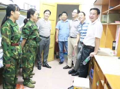 本网讯(通讯员 刘会敏 夏慧琳)9月13日晚上,我院党委书记田茂军、院长罗惠缙、党委副书记向军、院长助理彭广林、学工办主任王江生等领导来到大田湾校区学生宿舍亲切看望了我院2015级新生,另外陪同看望的还有各级辅导员及2015级各班级导师。 田茂军一行人来到操场看望了开始军训的新生。新生们穿着挺拔的军装、立正站好,姿态昂扬。王江生向新生一一介绍了我院各位领导与老师,并叮嘱大家要好好训练。