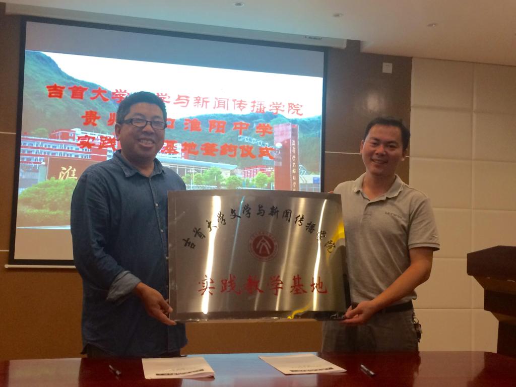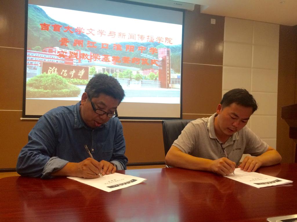 ,田茂军代表学院与江口淮阳中学校长代宁签订了实践教学基地建设协议,并举行了基地授牌仪式。我院学工办主任王江生、2016级辅导员张湘华,江口淮阳中学副校长陈海霞、政教处主任龚正、办公室主任陶钰琳出席了签约授牌仪式。