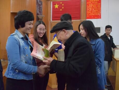 图为 李泽南老师讲话(邓丽倩摄) 他在去年给八个学院赠过书,得到了学生们的热烈欢迎,收到了一本本编订成册的读后感,更有学生将书放于枕畔,以激励自己奋发向上。他幽默风趣地说:“你们的掌声和鼓励是我的精神食粮,这就是我不得老年痴呆的原因。”最后,他以诗言志,希望大家在书中体会和学习到全心全意为人民服务的精神。学员们听得专注而认真,掌声久久不息。 李泽南老师为同学们赠书,每本书上,都有他为同学们亲手写上的名字,每赠一本书,他都会和蔼地嘱咐要好好学习。