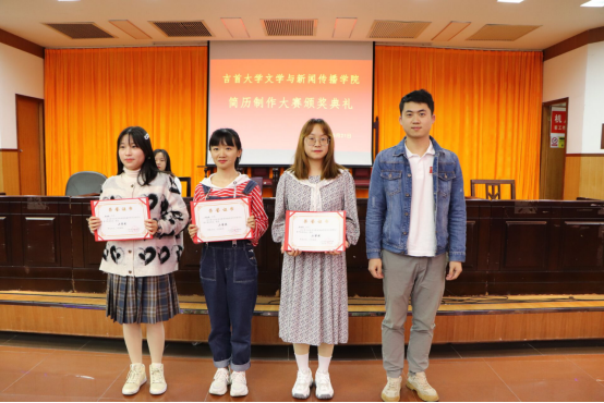 我院领导为简历制作大赛获奖的人员颁发证书。获得三等奖的有:粟明芳、杨晓琴、向扬扬、樊玲、苏布德、周敏、林思思,杜靖颁奖并合影留念;获得二等奖的有:包星河、何春艳、谢明秀、贺婉婷、黄娟,刘建新颁奖并合影留念;获得一等奖的有:马凡、林拉拉、何海瑶,段武城颁奖并合影留念。