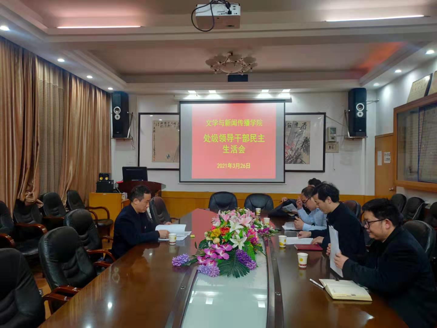 本网讯(文学院来稿)3月26日晚,我院处级领导干部民主生活会在影视鉴赏室召开。校党委委员、副校长姜又春到会指导。我院党委书记杨龙斌、副院长彭广林、党委副书记段武城、副院长王焕林参加会议。会议由杨龙斌主持。