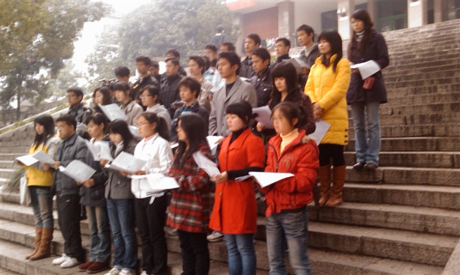 本网讯(实习记者曹楠 通讯员 肖璋)12月6日清晨,我校大田湾校区图书馆前、砂子坳校区总理楼前都传来朗朗的读书声,由我校国学社主办的“为中华之崛起而读书”主题晨读活动分别在新老校区举行。