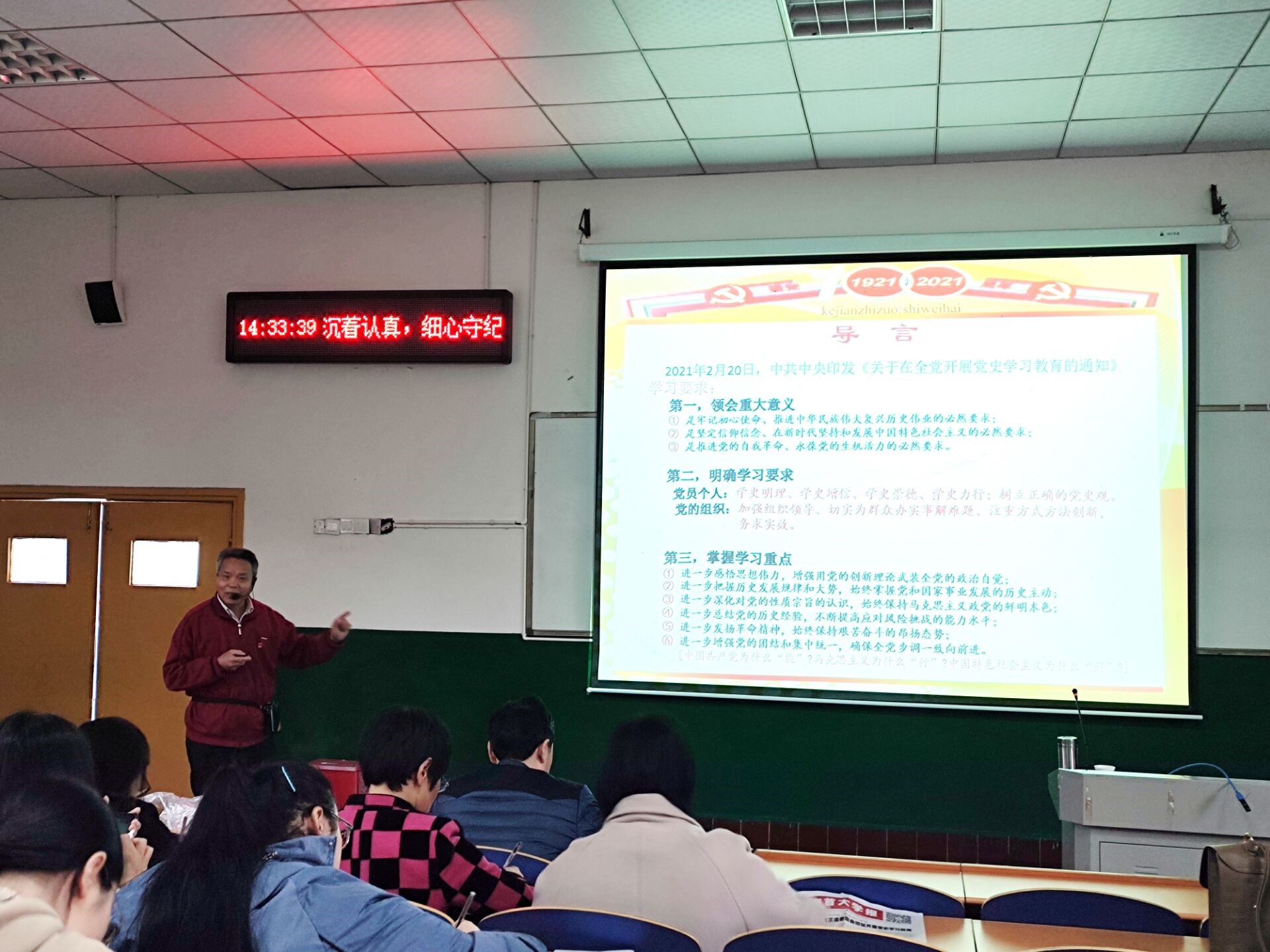 本网讯(通讯员 邱馨瑶 郑仁喆鋆)为倡导学院全体师生党员学党史,知党史,做新时代合格党员,我院于4月6日下午在砂子坳校区1207教室召开党史学习教育主题党课。党课由校关心下一代工作委员会秘书长石维海讲解,院党委书记杨龙斌主持,学院全体师生党员参加会议。