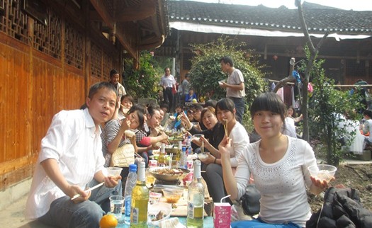 最后来到了首八峒沙湾村,受到了村民的欢迎,村民杀猪设长条宴来款待老师和同学们,接着大家参观了该村独具特色的土家族民俗陈列室。蔚蓝的天空下,暖风习习,实习生与老师们下棋,跳土家族摆手舞,笑声阵阵,不绝于耳。