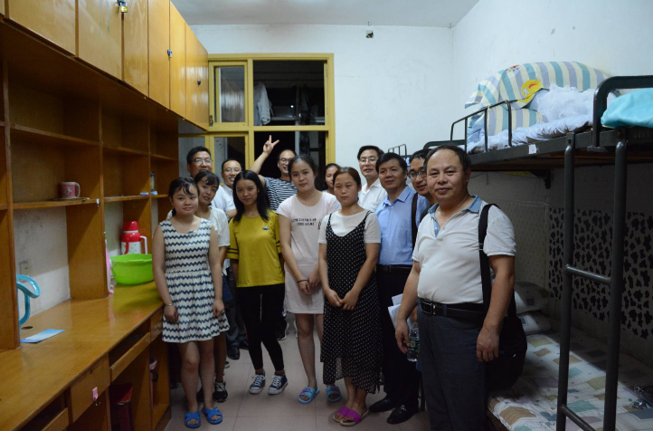 随后,一行人在2017级辅导员刘建新的带领下来到女生宿舍六栋。当天晚上天气闷热,辗转多个寝室,领导老师们的衣服早已被汗浸湿,却没有忽略每一个新生宿舍,“是哪里人呢?”、“什么时候到的?”“坐了多久的车呢?家长陪同来的还是自己来的呢?”领导老师们一遍又一遍地亲切询问,新生们也大方地向老师们介绍自己,向老师们了解自己的专业,介绍自己的家乡等等。在了解到我院女生住在6至8楼,罗院长表示希望她们能够克服高楼层困难,好好适应大学生活。田书记在看望8楼的新生时幽默地说“住最高层可以每天爬楼梯锻炼锻炼身体。”现场交谈氛围热闹融洽。