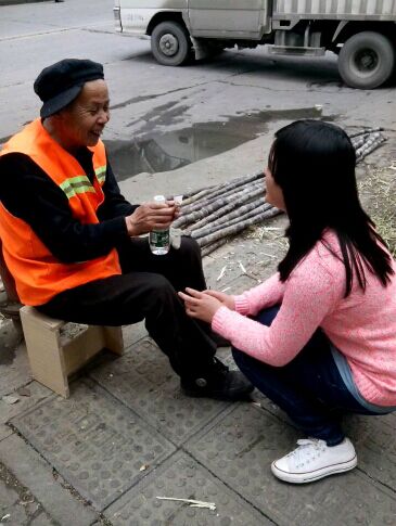 同学们分成8组,每组5人。随后,同学们来到大田湾校区附近的街道,寻找正在劳动的环卫工人,走近他们,为他们递上一瓶矿泉水,并说:“谢谢你们认真清扫街道,才有清洁干净的城市环境,你们你们辛苦了。”一位背着大背篓的老人接过水后,不停地说:“谢谢,谢谢,谢谢孩子们。”接着,同学们来到一处建筑工地,还为建筑工人送去了矿泉水。