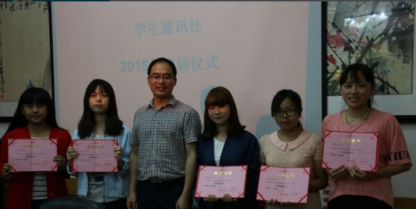 图为 彭广林老师与优秀通讯员合影(夏慧琳 摄) 主持人宣读2014—2015学年学通社表彰名单,包括优秀学生记者、优秀通讯员,并由彭广林老师颁发荣誉证书。此后,彭广林老师发言,他告诫学通社成员们,对待工作要认真、积极,要有毅力,能够坚持,要正确看待记者工作的困难,并在不断的磨练中成长。