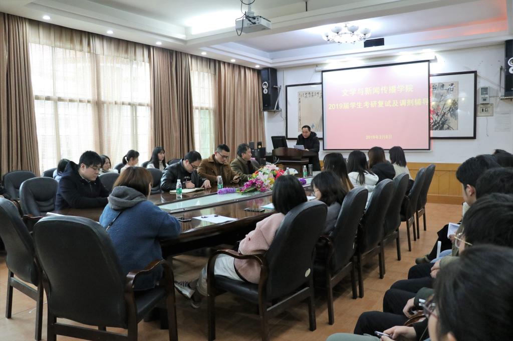 本网讯(学生记者 王捷)3月8日下午,我院2019届考研学生在砂子坳校区影视鉴赏室参加了学院开展的考研复试和调剂辅导会议,校研究生院招生管理科科长肖宪平应邀前来我院为考研学生进行辅导。院党委书记陆升合、党委副书记向军、副院长彭广林等出席本次辅导会议。辅导会议由向军主持。