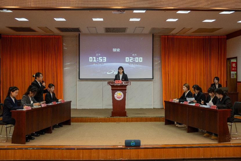 首场交锋辩题为:AI冲击下的专业深耕与跨界突围。正方两方就"AI冲击下大学生应侧重专业深耕还是跨界适应"展开思想博弈。双方通过多维视角展开攻防,在立论环节系统构建理论框架,自由辩论阶段更呈现白热化态势。正方着重论证专业根基对跨界融合的支撑作用,反方则强调技术革命背景下适应性发展的必要性,双方均辅以详实数据与经典案例强化论点。