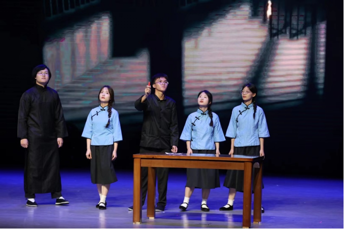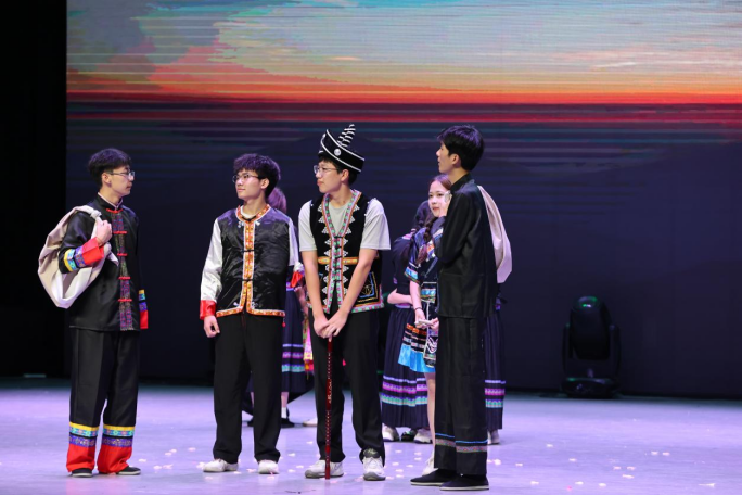 展演在舞台剧排练花絮视频中拉开帷幕,5幕舞台剧轮番上演。数名2022级网络与新媒体专业学生在舞台上倾情演绎,为大家献上了一场精彩绝伦的视听盛宴,并通过这样的表演形式彰显着青年学生的担当作为。比如在《觉醒年代·青春》中,青年学子们与陈独秀和李大钊等众先生们在长城上“论道”“寻路”,歌咏“青春”。“以青春之我,创建青春之家庭,青春之国家,青春之民族,青春之人类,青春之地球,青春之宇宙”,青年之声,振聋发聩!在原创剧《湘鼓声声送君行》中,学生们演绎了湘西儿女在家国动荡,国之大义面前,放下儿女情长,远赴战场抗击倭寇、保家卫国的感人热血故事。