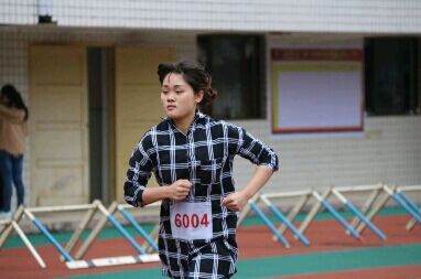 伴随着同学们的加油呐喊声,400米赛道上一抹靓丽的身影随即弹起飞奔出去。她是来自我院13级中师二班的蒲丽文,瘦小的个子却有强大的爆发力。