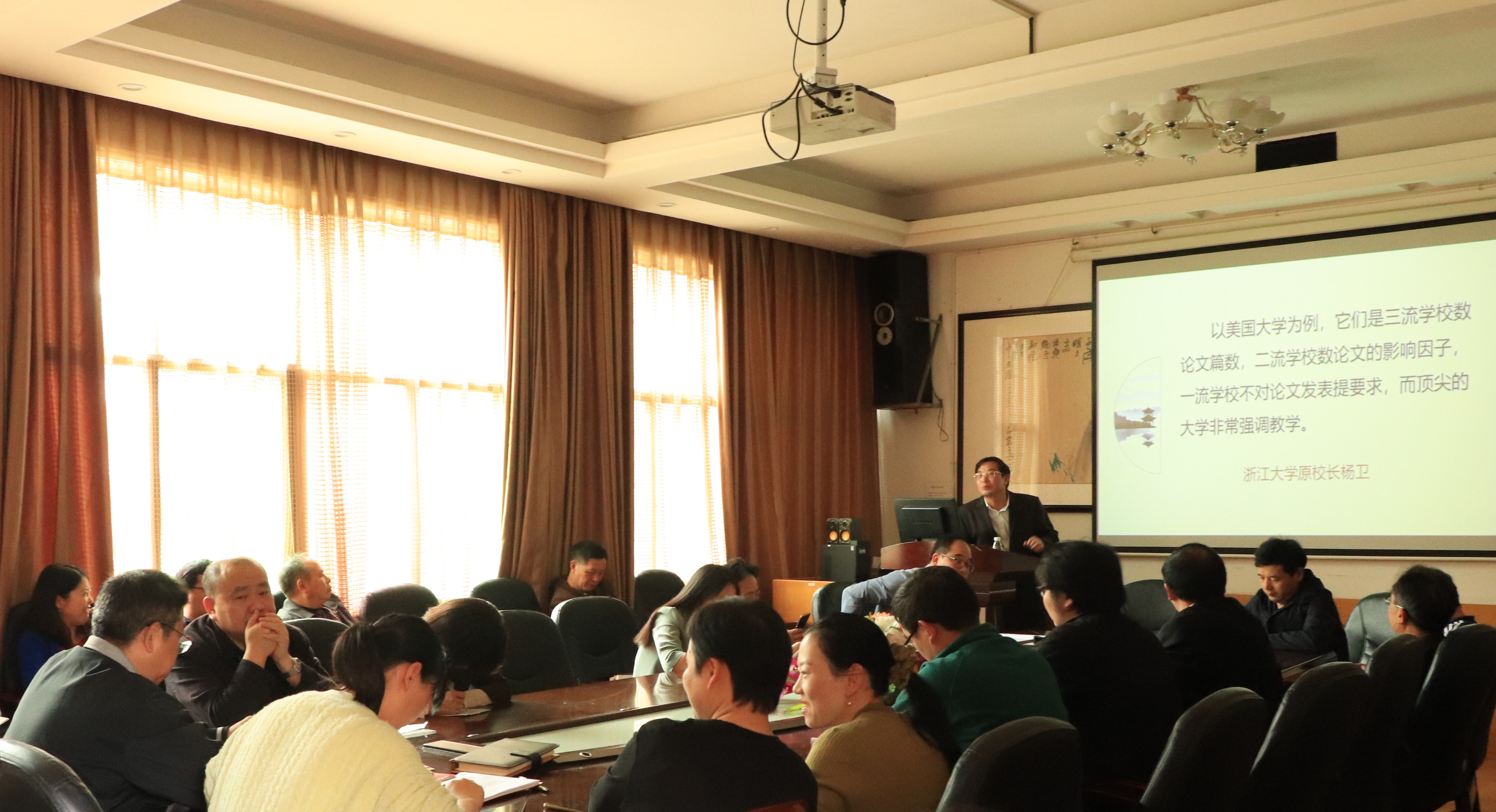本网讯(通讯员 杨佳 韩聪慧)10月13日下午,为端正教学态度,总结教学经验,反思教学不足,聚焦教学效果,我院全体教职工于影视鉴赏室召开教学工作专题会。我院党委书记杨龙斌、院长罗惠缙、副院长彭广林及全体教职工参加此次会议。会议由罗惠缙主持。