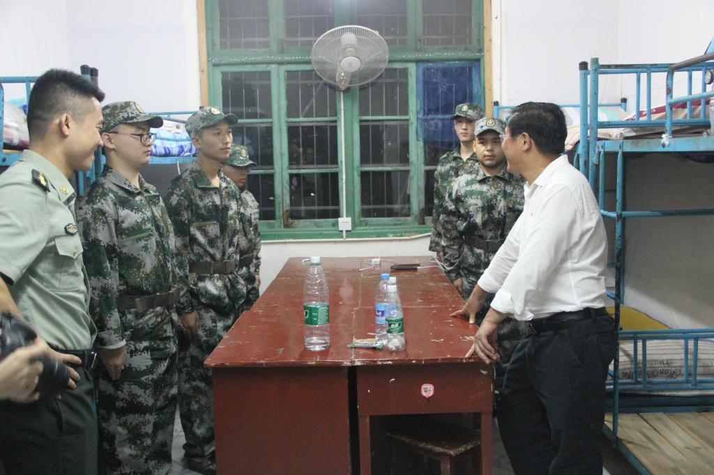 罗惠缙、刘建新一行和杨龙斌、尹瑜璞一行分别前往大田湾校区和砂子坳校区各新生寝室慰问2019级新生。寝室新生全都穿好军训服分立寝室两侧,向进来的领导老师齐声问好。罗惠缙亲切询问学生们来自哪里,是否适应新环境。希望他们充分利用好军训的时间锻炼自己,同时遇到问题也要及时向教官反映。