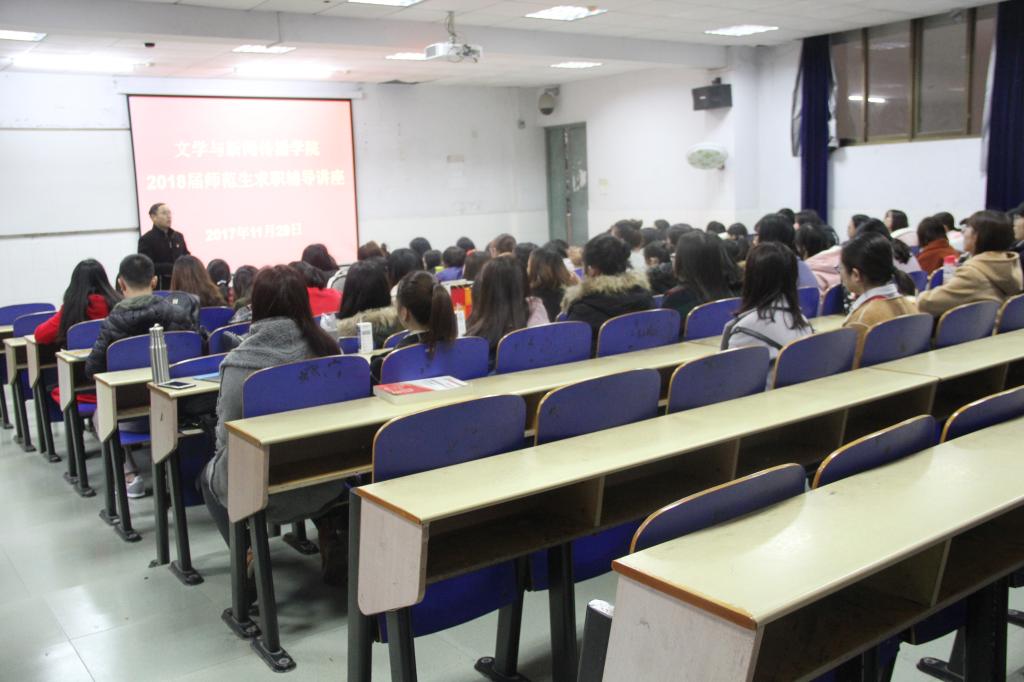 本网讯( 通讯员孙续卉 吴璇 )11月29日,在校砂子坳校区60316教室,我院开展了2018届师范生求职辅导讲座。党委副书记向军,院长助理盛竞凌,中文系主任张利玲,2014级辅导员鲁明新到场参加讲座。讲座由向军主持。