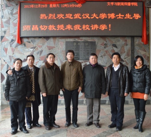 本网讯(记者 秦莉平 旷育强)12月29日中午在我院影视鉴赏室,武汉大学昌切教授主讲了一场主题为“谈莫言作品文艺与政治的关系”的学术讲座。我院唐生周教授、朱艳阳博士,盛竞凌副教授,粟幸福老师,刘泽友老师和一些感兴趣的学生等参加了此次讲座。讲座由刘泽友老师主持。