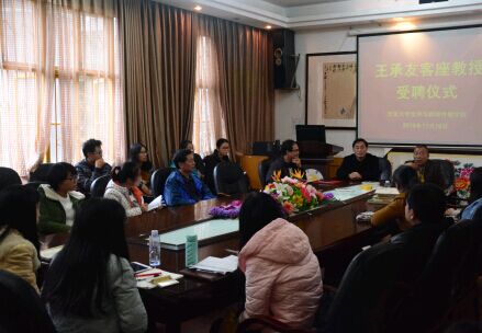 本网讯(通讯员 李雨维 黄帅帅)11月19日下午,中央电视台《走进中国》栏目编导王承友被聘为我院客座教授,授聘仪式在我院影视鉴赏室举行。院长罗惠缙及教师代表陈文敏、傅秀政、粟龙梅、罗军等参加仪式。仪式由院长助理彭广林主持。