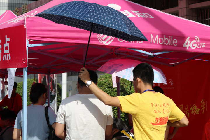 图为 辅导员为新生家长打伞