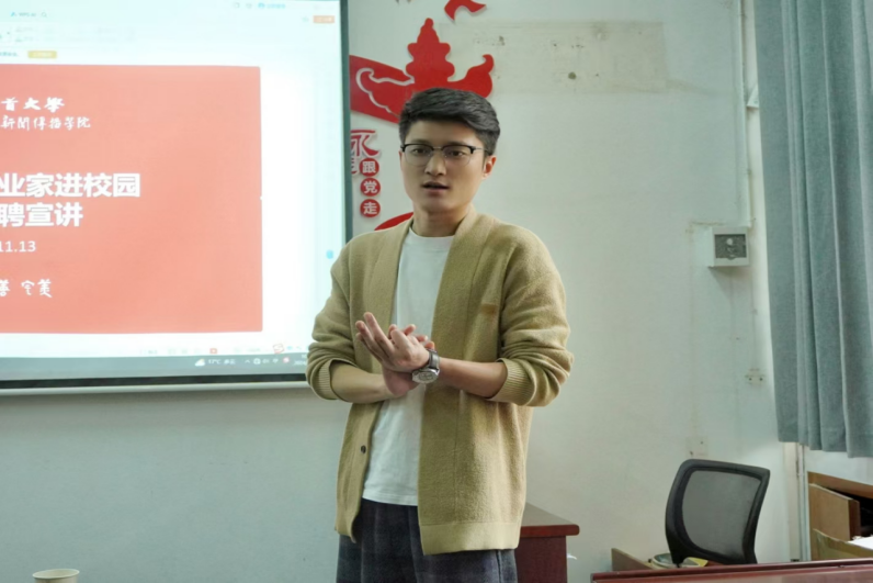 本网讯(通讯员 张雨童 王博 彭雯萱 彭正贤) 11月为学院2025届毕业生求职校园招聘月。11月13日上午,创始文化负责人金董洙、常德舞霖传媒负责人邱建、2008级优秀校友吴仁浩四家企业来文学与新闻传播学院进行校园招聘并进行宣讲。宣讲会由学院就业专干吕定红主持。